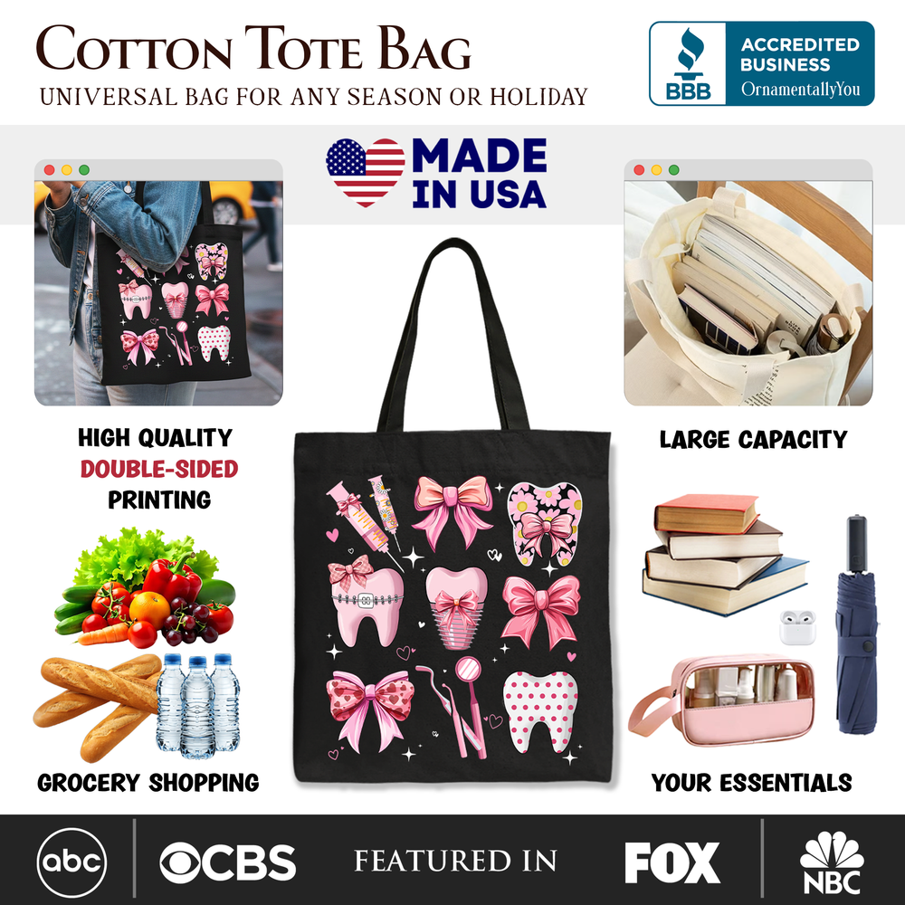 Dental Squad Coquette Canvas Tote Bag, Pink Teeth Dentist Life Bow Gift Shopper