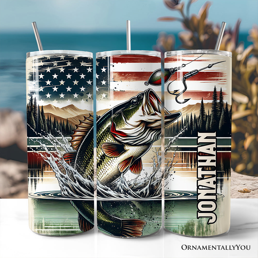Patriotic Bass Fishing 20oz Personalized Tumbler With Lid and Stainless Steel Straw, Retro Angler Gift Cup