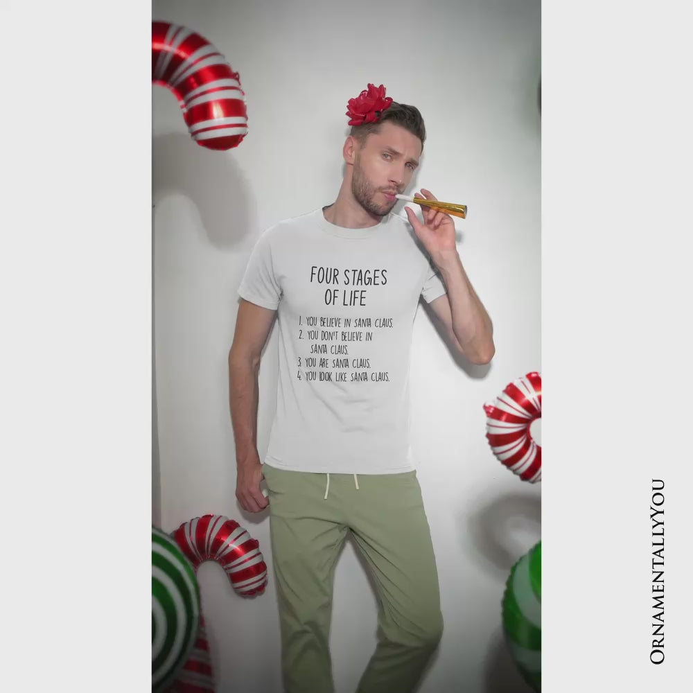 Men’s Four Stages of Life Santa Claus T-Shirt, Holiday Humor Christmas Text Tee