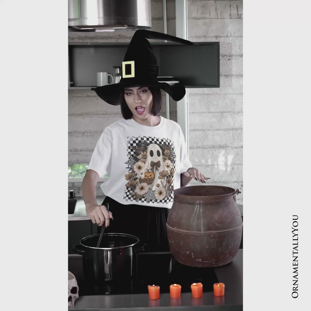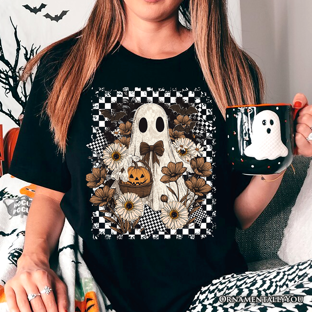 Retro Ghost Floral Halloween T-Shirt, Spooky Vintage Checkered Tee