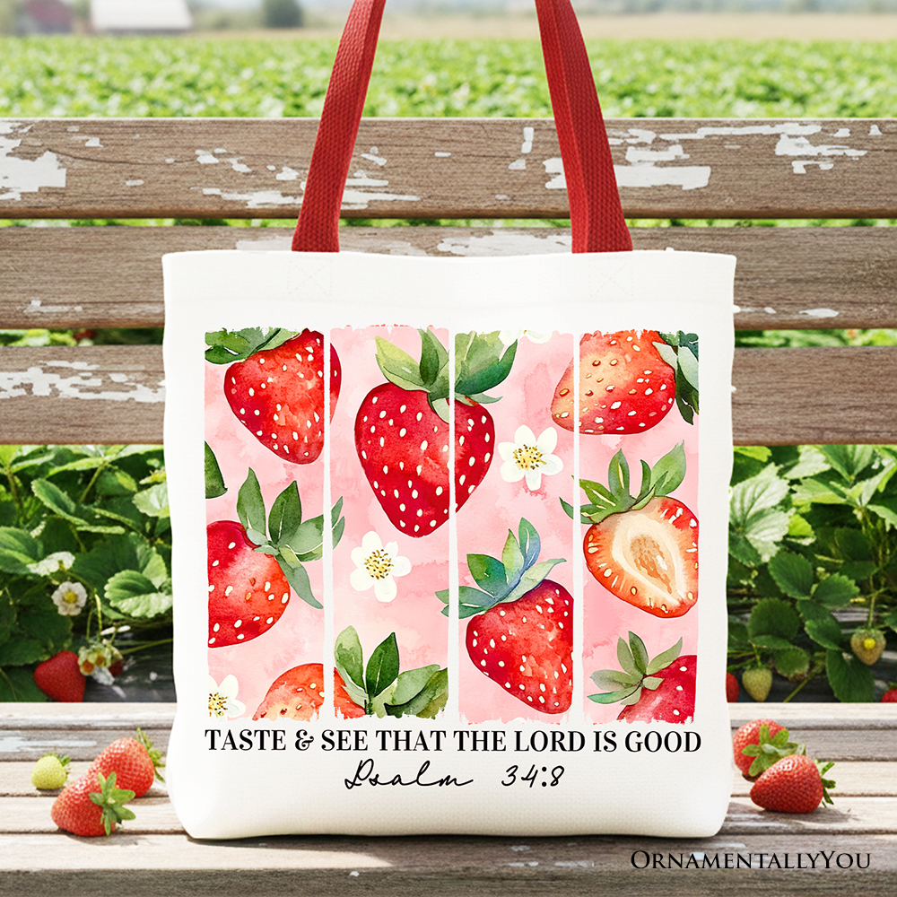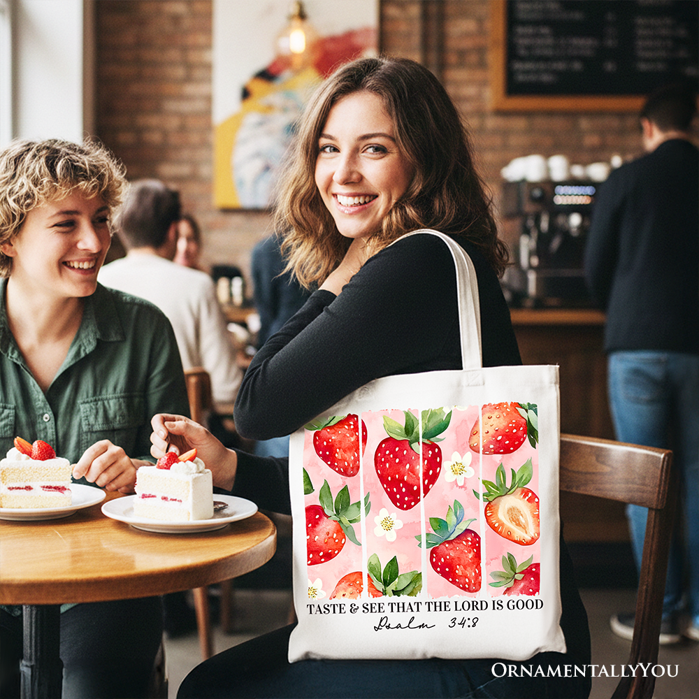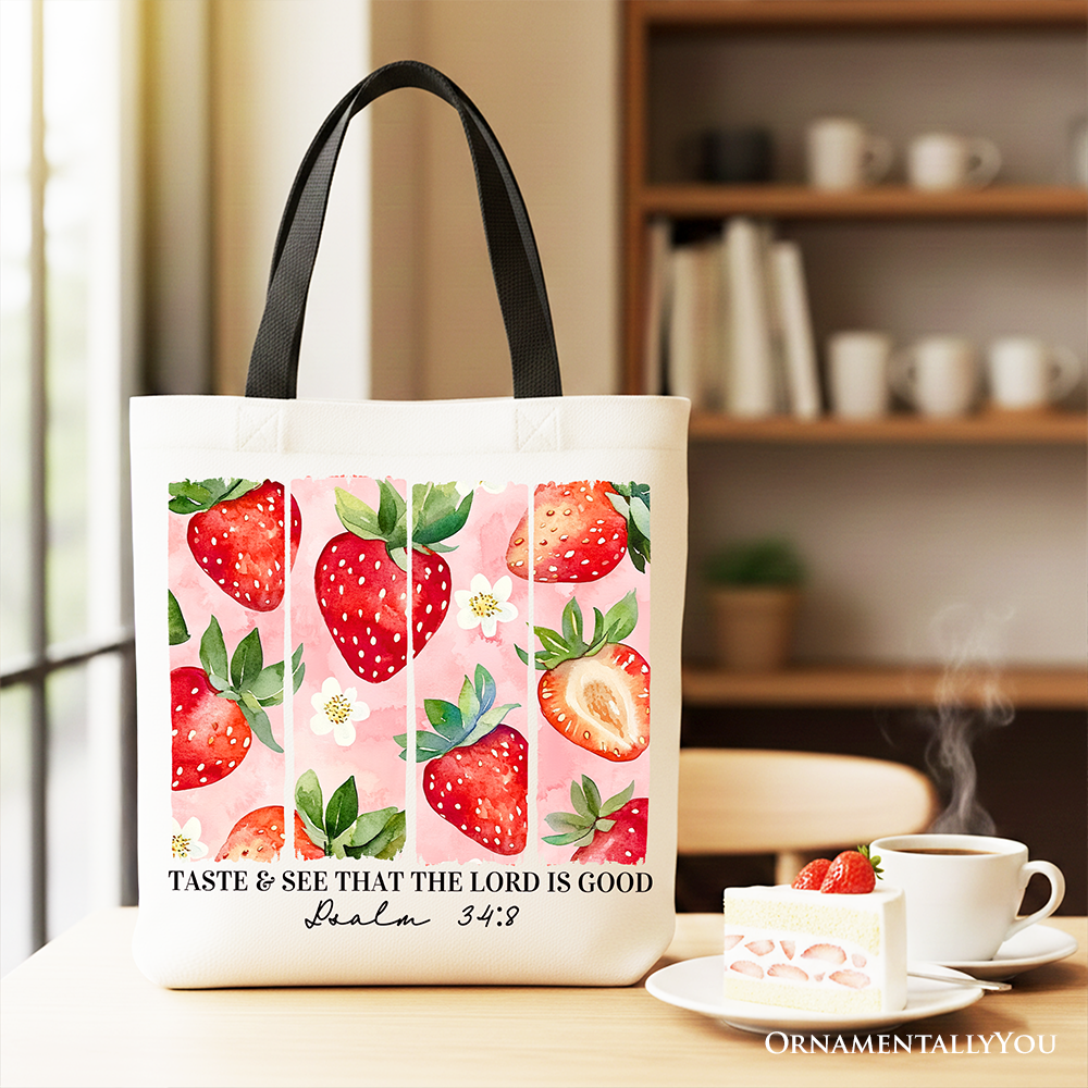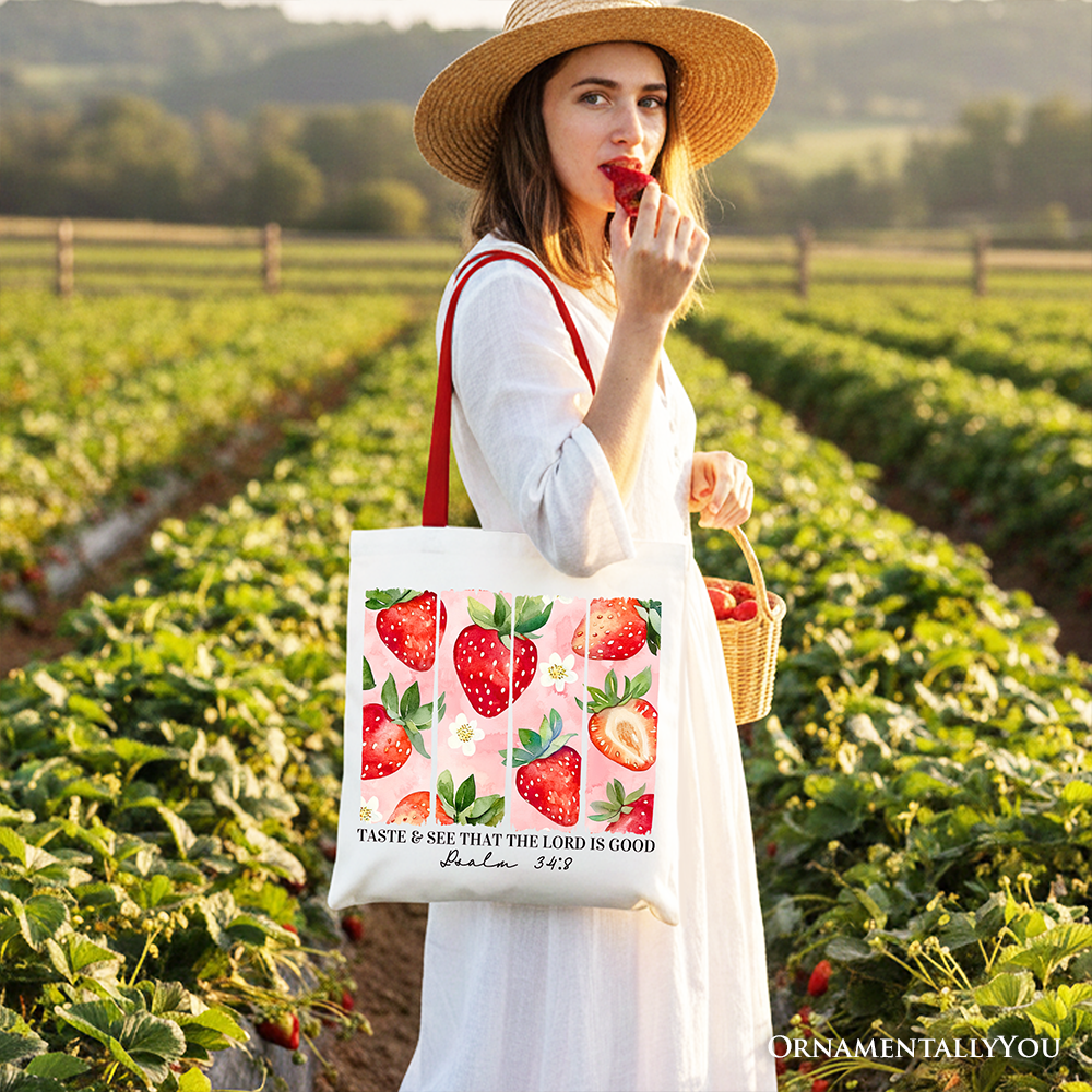 Taste and See That The Lord is Good Strawberry Canvas Tote Bag, Christian Faith Gift Shopper