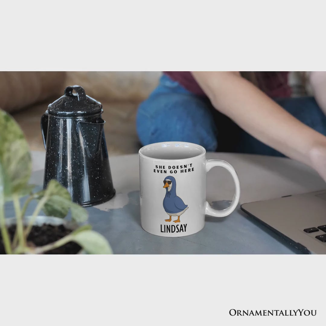 She Doesnโt Even Go Here Silly Goose Personalized Mug, Mean Girls Funny Meme Gift with Custom Name