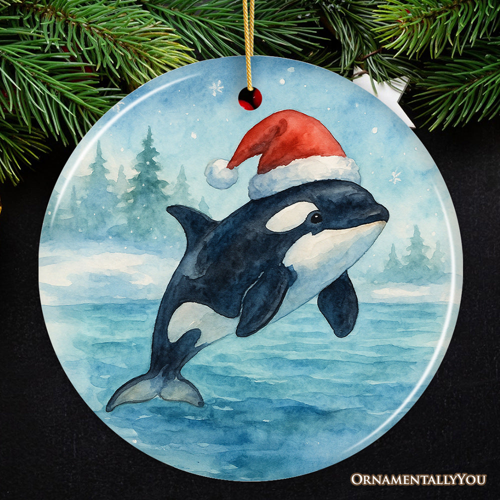 Watercolor Orca in Santa Hat Christmas Ornament, Marine Animal Holiday Keepsake and Gift