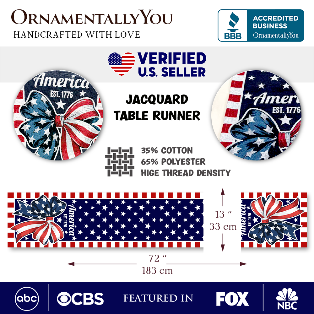 Patriotic Bow 72" Jacquard Table Runner, High Quality Holiday Rectangle Tablecloth with Red White Blue Design