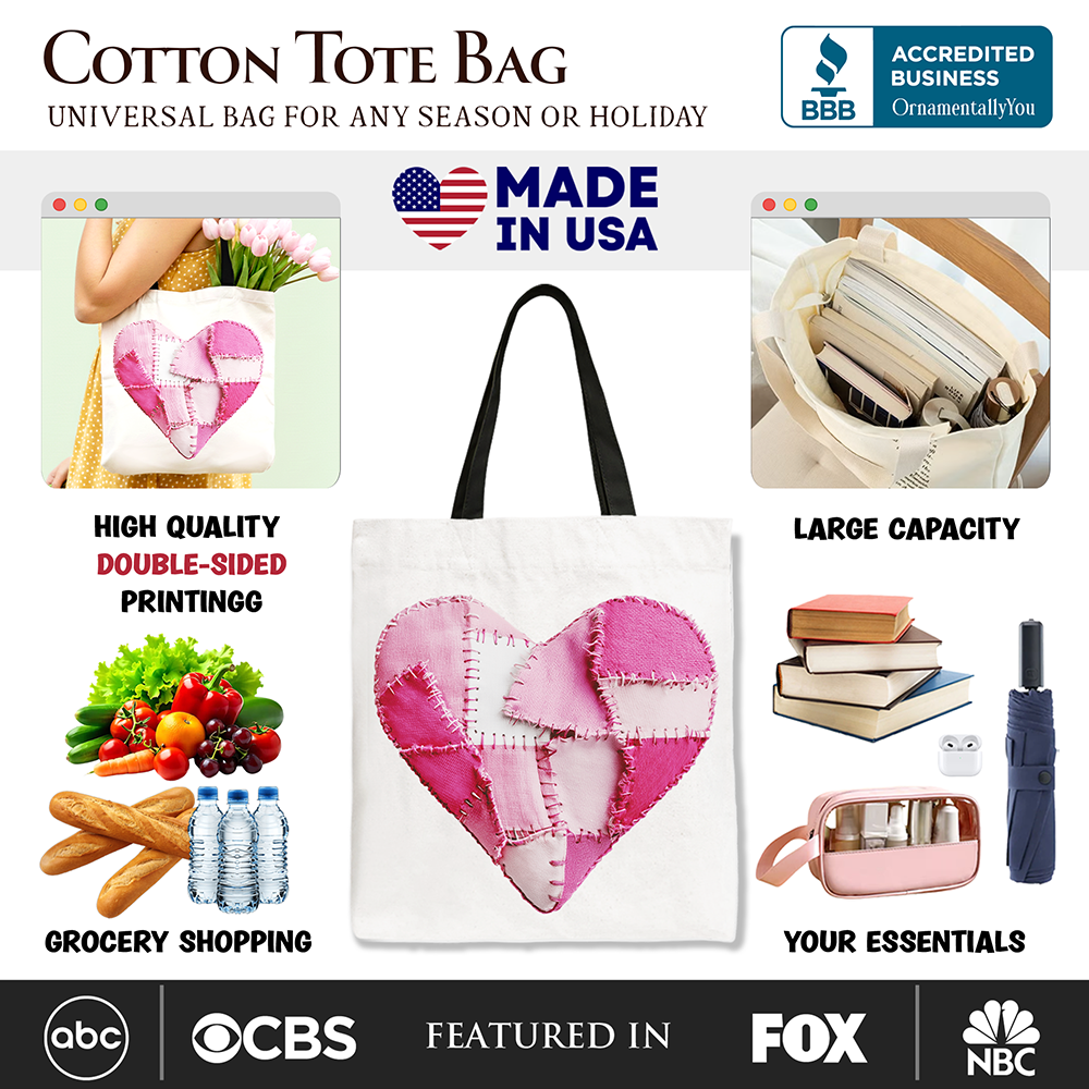 Patchwork-Style Pink Heart Canvas Tote Bag, Vintage Valentine Coquette Love Printed Gift Bag