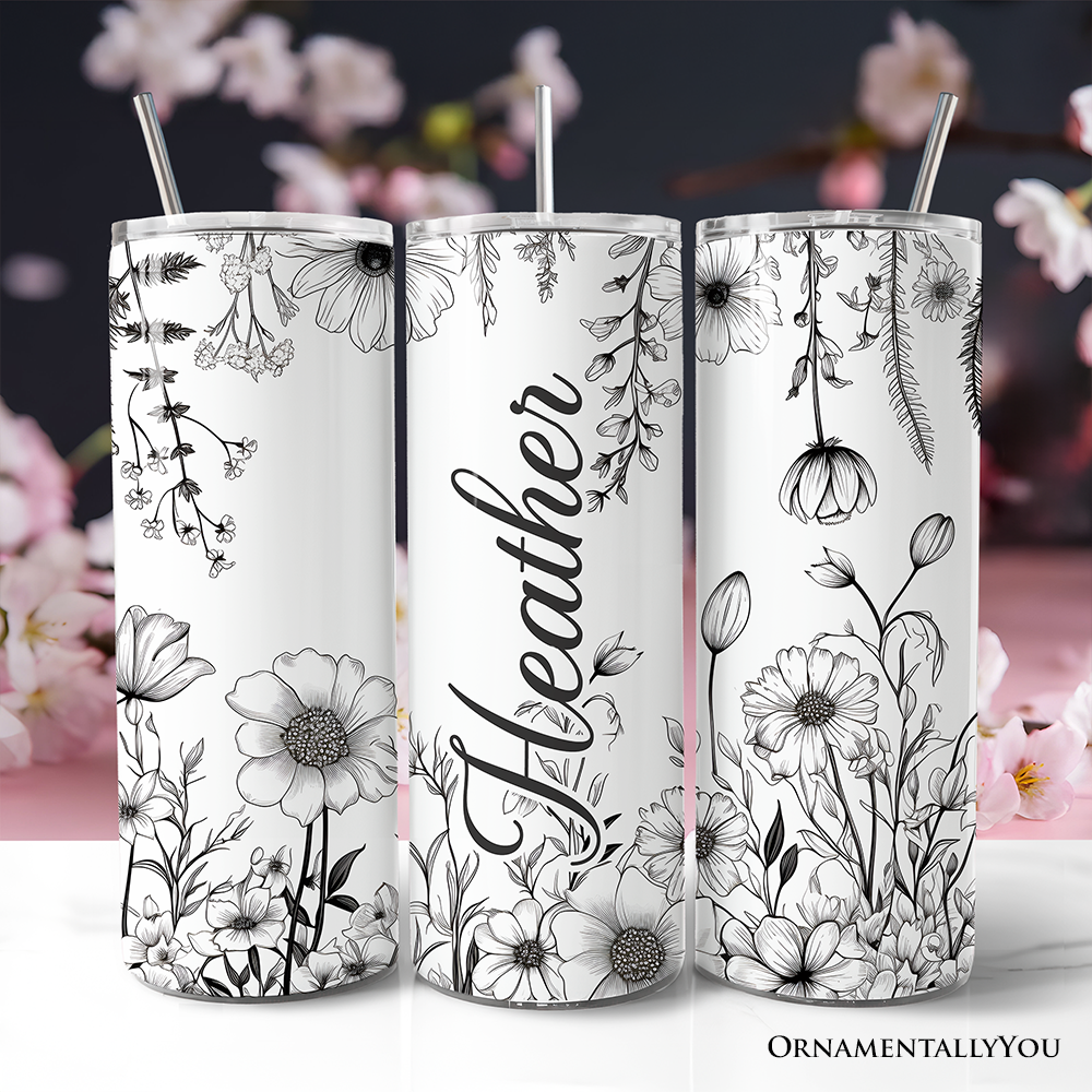 White and Black Wild Flowers Tumbler With Lid and Stainless Steel Straw, Beautiful Spring Travel Mug Gift