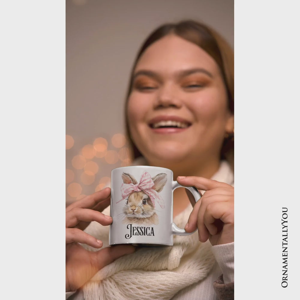 Easter Bunny Coquette Pink Bow Personalized Mug, Cute Watercolor Spring Gift with Custom Name