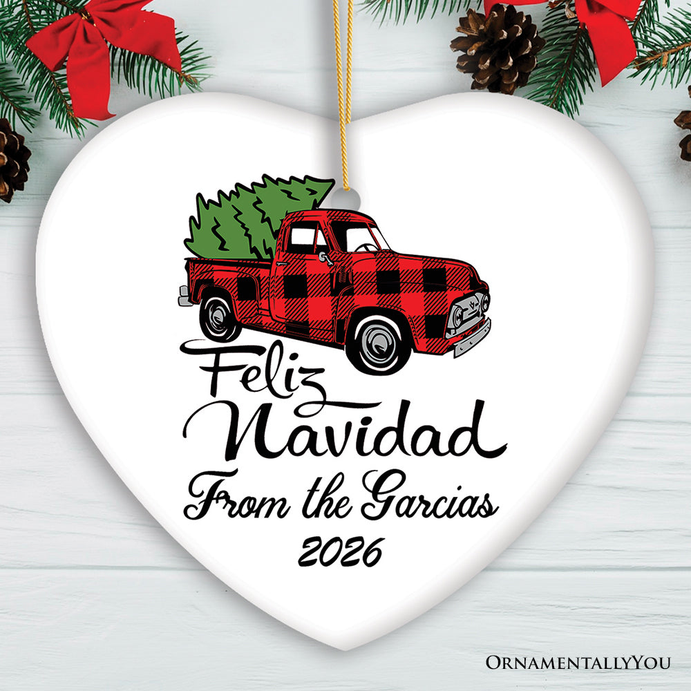 Personalized Feliz Navidad Plaid Red Truck Family Christmas Ornament