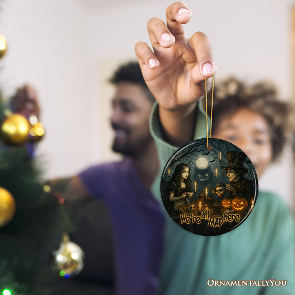 Whirling with gothic fantasy and eerie delight, this haunting ornament brings a macabre twist to Aliceโs Adventures in Wonderland, capturing a moonlit tea party with the Mad Hatter, a somber Alice, and the grinning Cheshire Cat. Surrounded by glowing pumpkins, skull teapots, and flickering candles, it radiates an atmosphere both whimsical and unsettling. A perfect collectible for dark fantasy lovers and Halloween dreamers, it turns the classic tale into a chillingly beautiful piece of art.