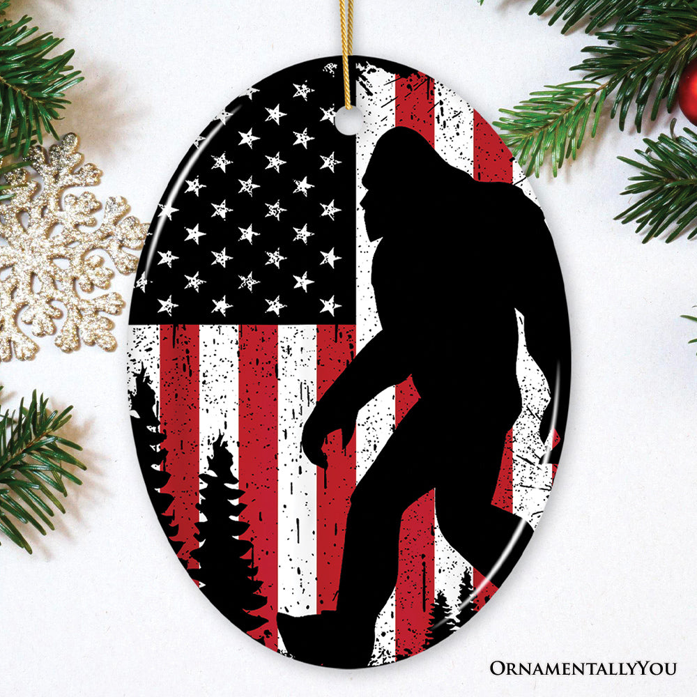 Bigfoot American Flag Ornament, Patriotic Sasquatch Gift and Tree Decor