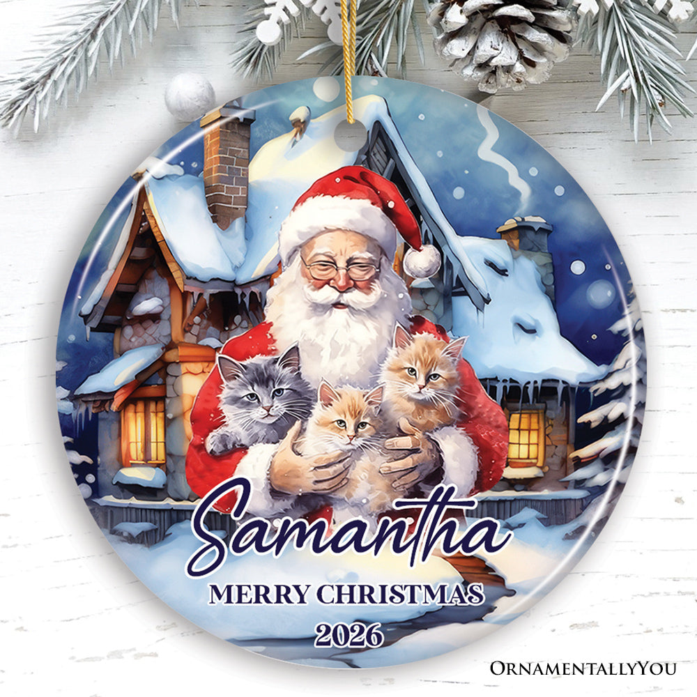 Cute Santa With Cats Personalized Ornament, Festive Christmas Gift With Custom Name and Date