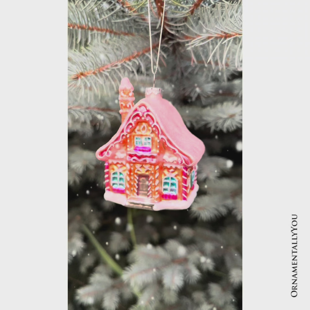 Frosted Pink Cottage Glass Christmas Ornament, Sugar Sweet Gingerbread Home Holiday Tree Decoration