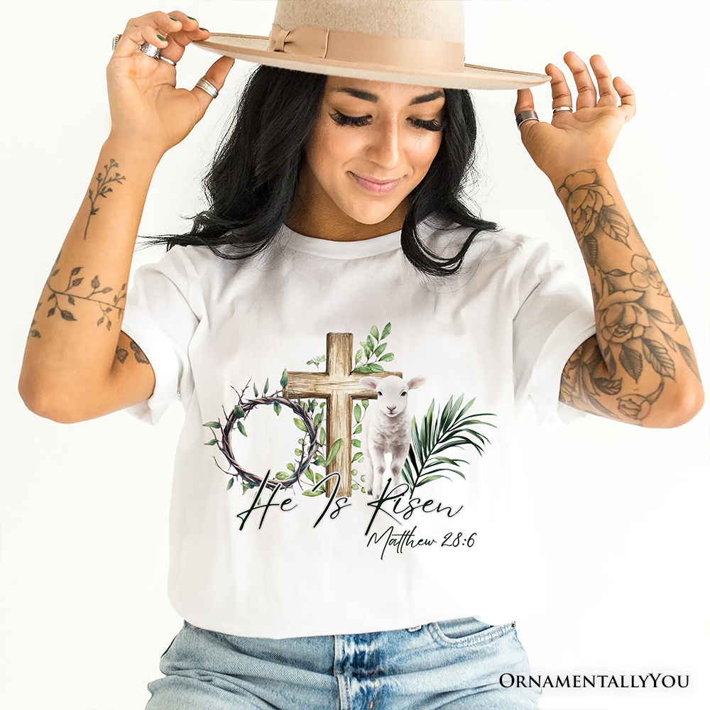 Express your faith in a meaningful and stylish way with this Christian Easter T-shirt featuring the powerful “He Is Risen” message, a symbolic lamb, cross artwork, and the inspiring Bible verse Matthew 28:6. Designed for believers who appreciate scripture-inspired apparel, this soft and comfortable Christian graphic tee is ideal for Easter church gatherings, Sunday worship, fellowship events, prayer groups, or everyday wear. The timeless biblical design highlights the resurrection message while pairing easily with jeans, skirts, or casual outfits. A thoughtful choice for anyone searching for Christian shirts, Bible verse T-shirts, religious Easter apparel, faith-based clothing, or inspirational church wear. ✝️🐑🌿