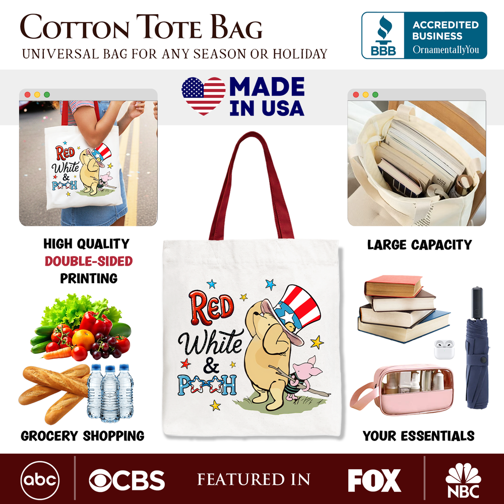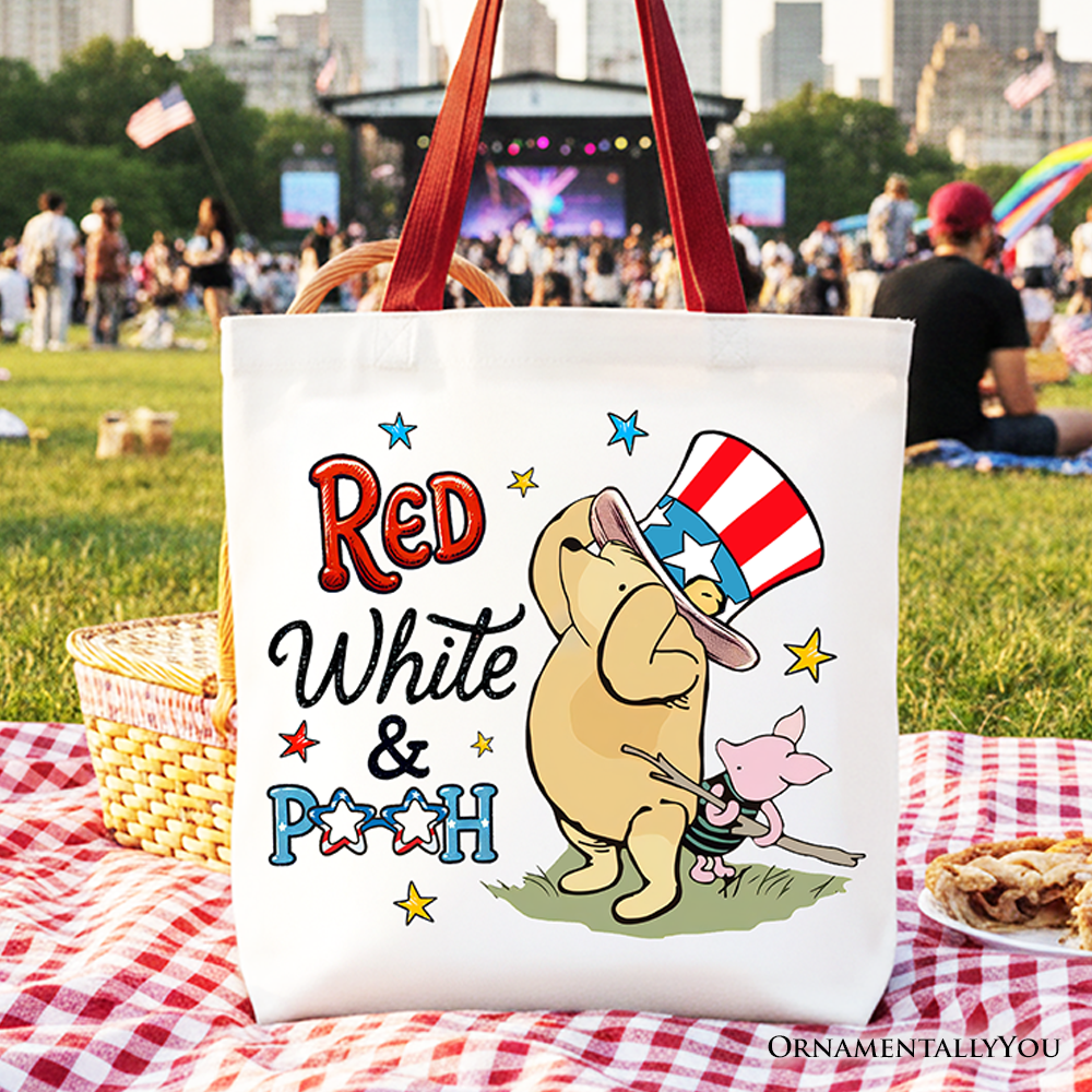 Red White & Proud Tote Bag, Patriotic 4th of July Celebration Pooh Bear Gift Shopper