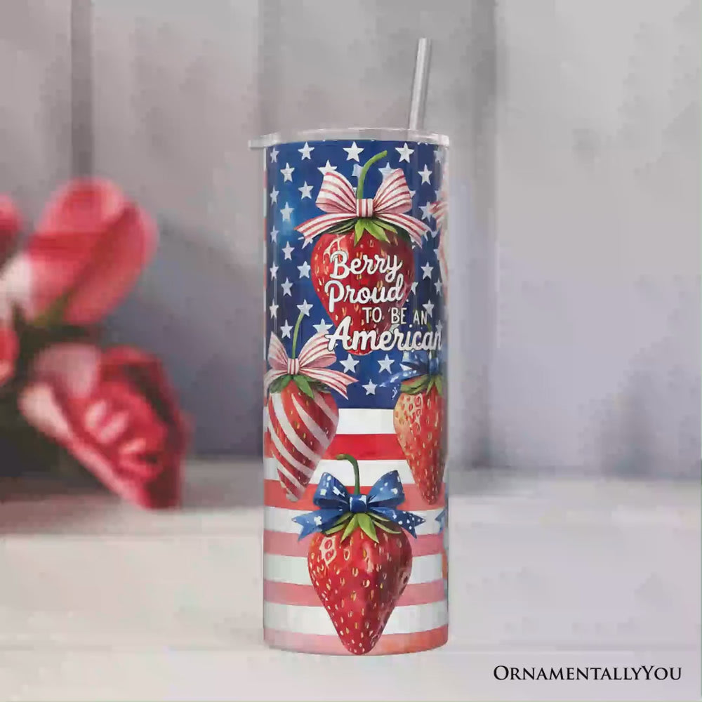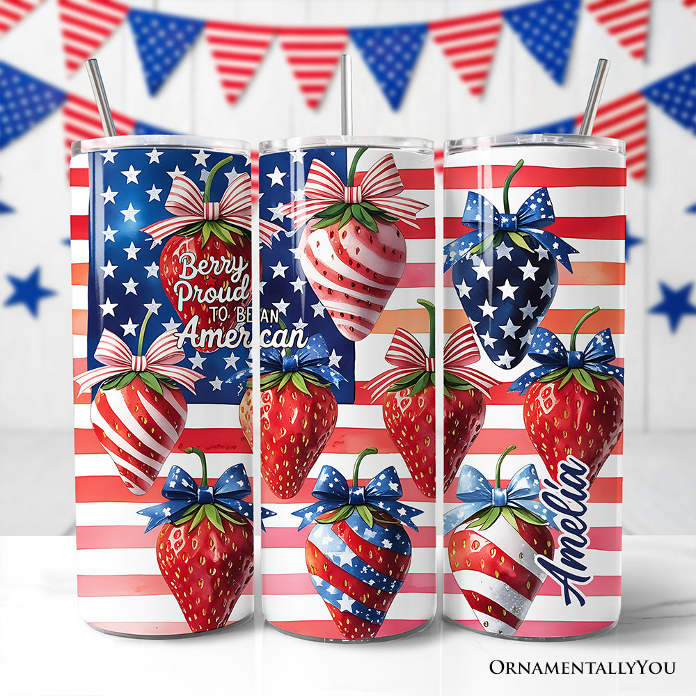 Berry Proud to Be an American 20oz Personalized Tumbler With Lid and Stainless Steel Straw, Patriotic Strawberry 4th of July Gift Cup