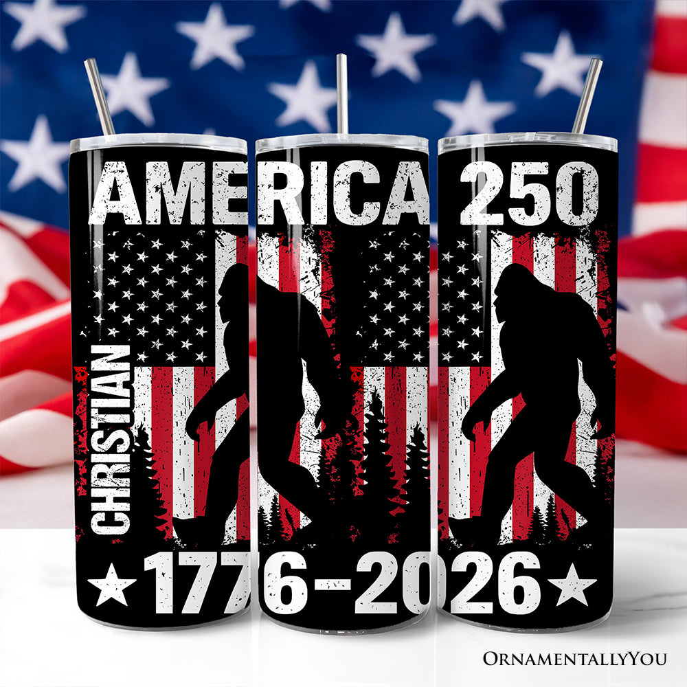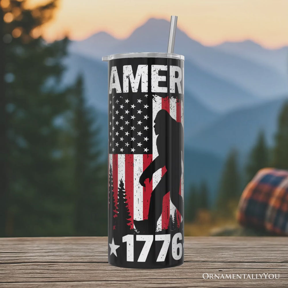 Bigfoot American Flag 20oz Personalized Tumbler With Lid and Stainless Steel Straw, Patriotic Sasquatch Gift Cup