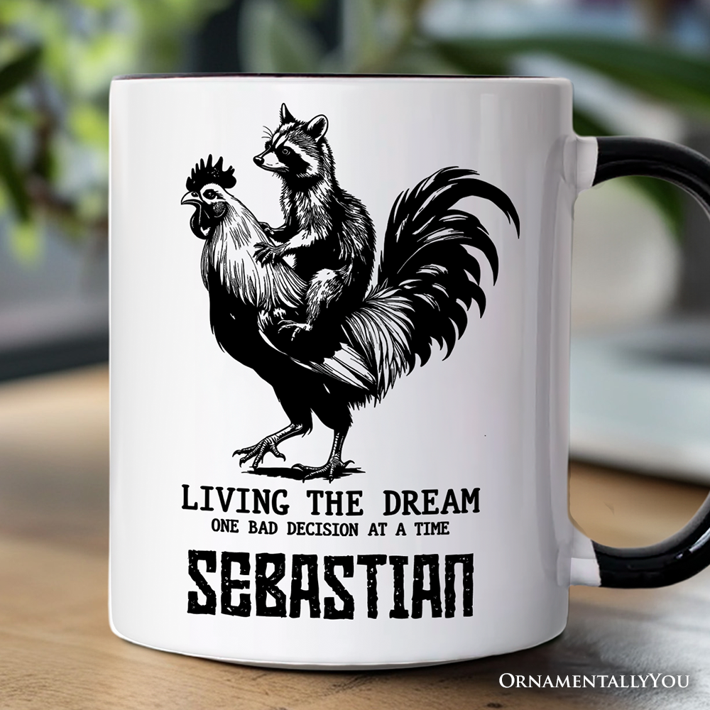 Living the Dream Funny Rooster and Raccoon Personalized Mug, Sarcastic Quote Gift with Custom Name