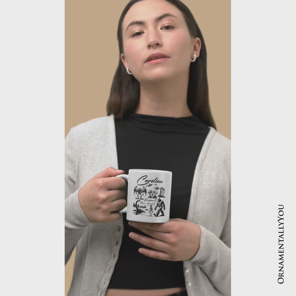 Respect The Local Cryptid Squad Personalized Mug, Funny Bigfoot Alien Mothman Meme Gift with Custom Name