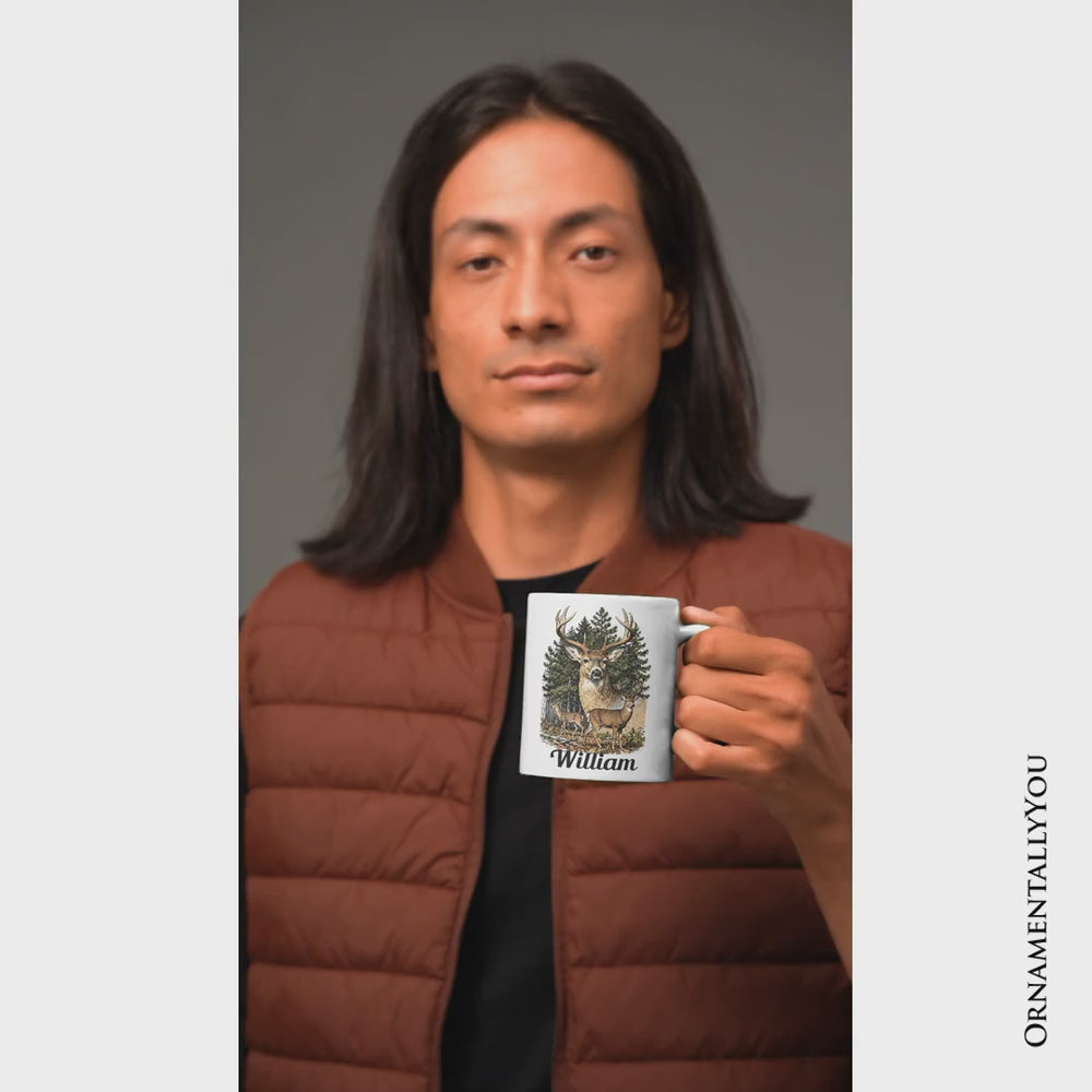 Forest Deers Vintage Grunge Personalized Mug, Retro Hunter Gift with Custom Name
