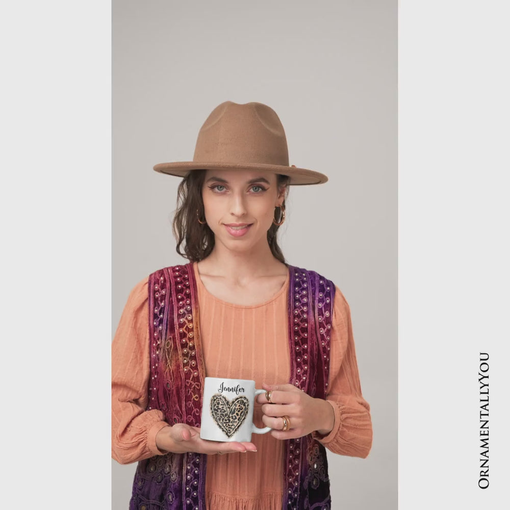 Leopard Heart Valentine Personalized Mug, Watercolor Love Gift with Custom Name