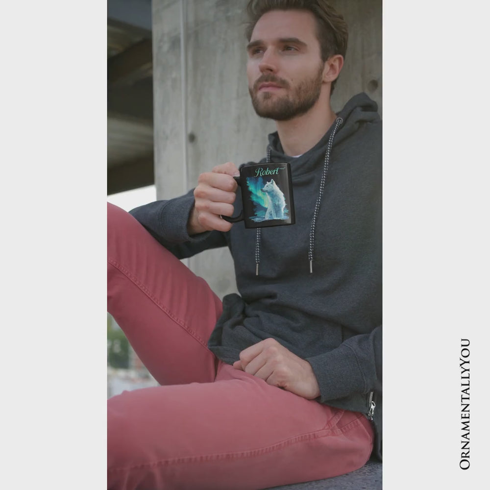 Wild Aurora White Wolf Personalized Mug, Northern Lights Arctic Wolf Gift with Custom Name