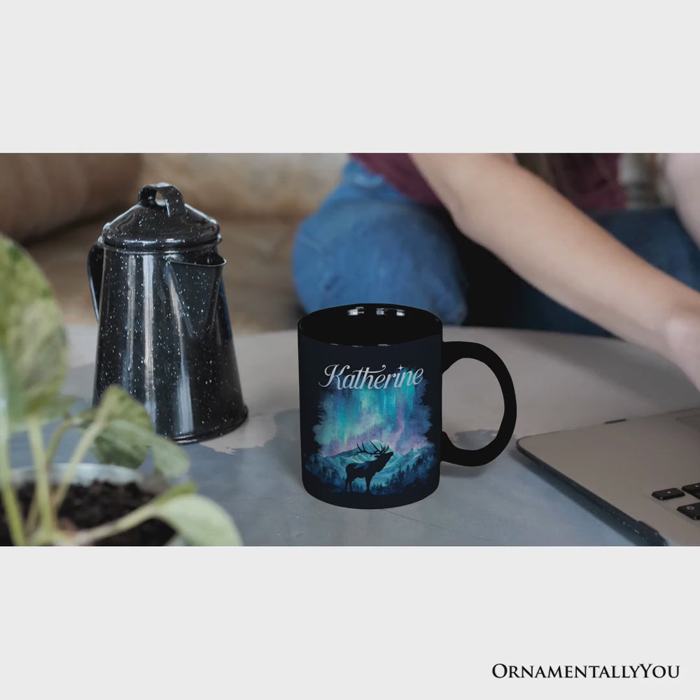 Majestic Aurora Elk Personalized Mug, Northern Lights Wilderness Stag Gift with Custom Name