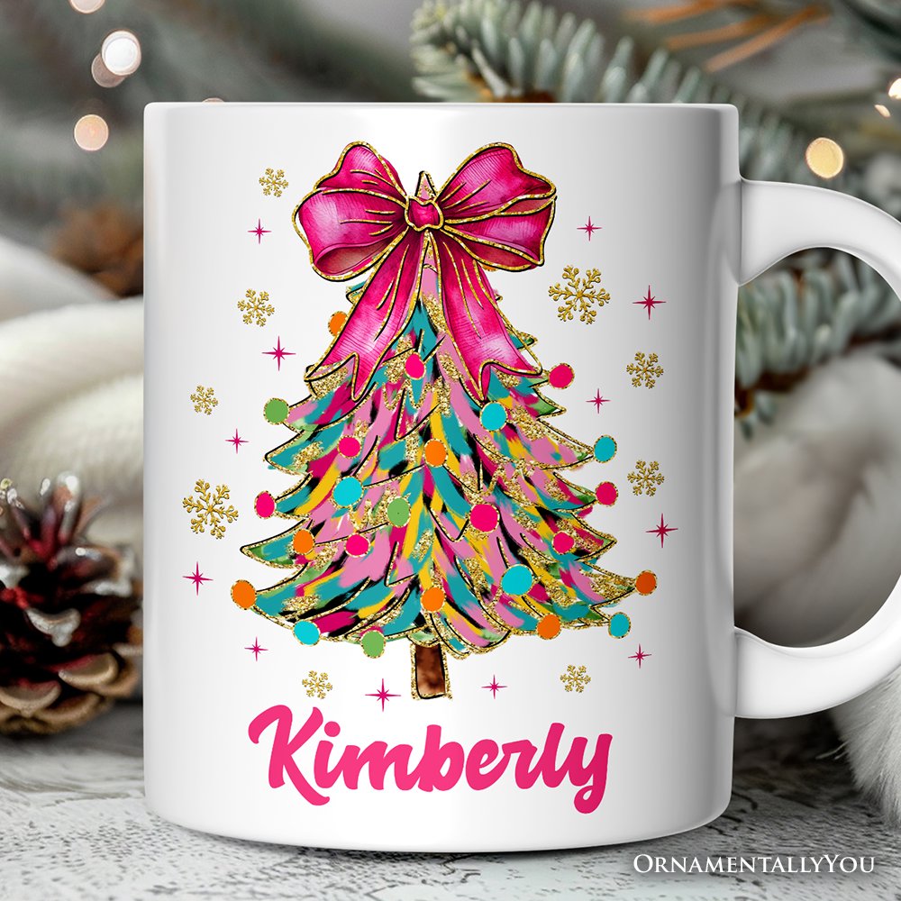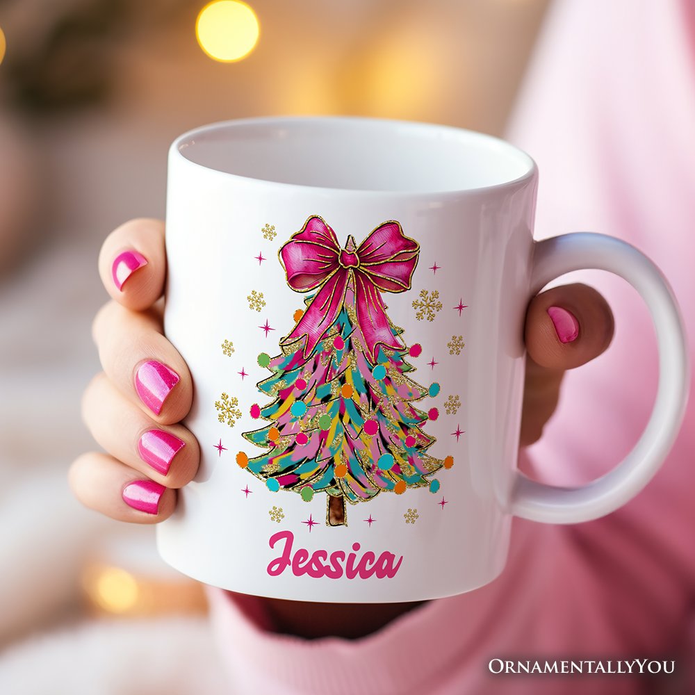 Colorful Glitter Christmas Tree Pink Bow Personalized Mug, Pink Bow Coquette Holiday Gift with Custom Name Personalized Ceramic Mug OrnamentallyYou