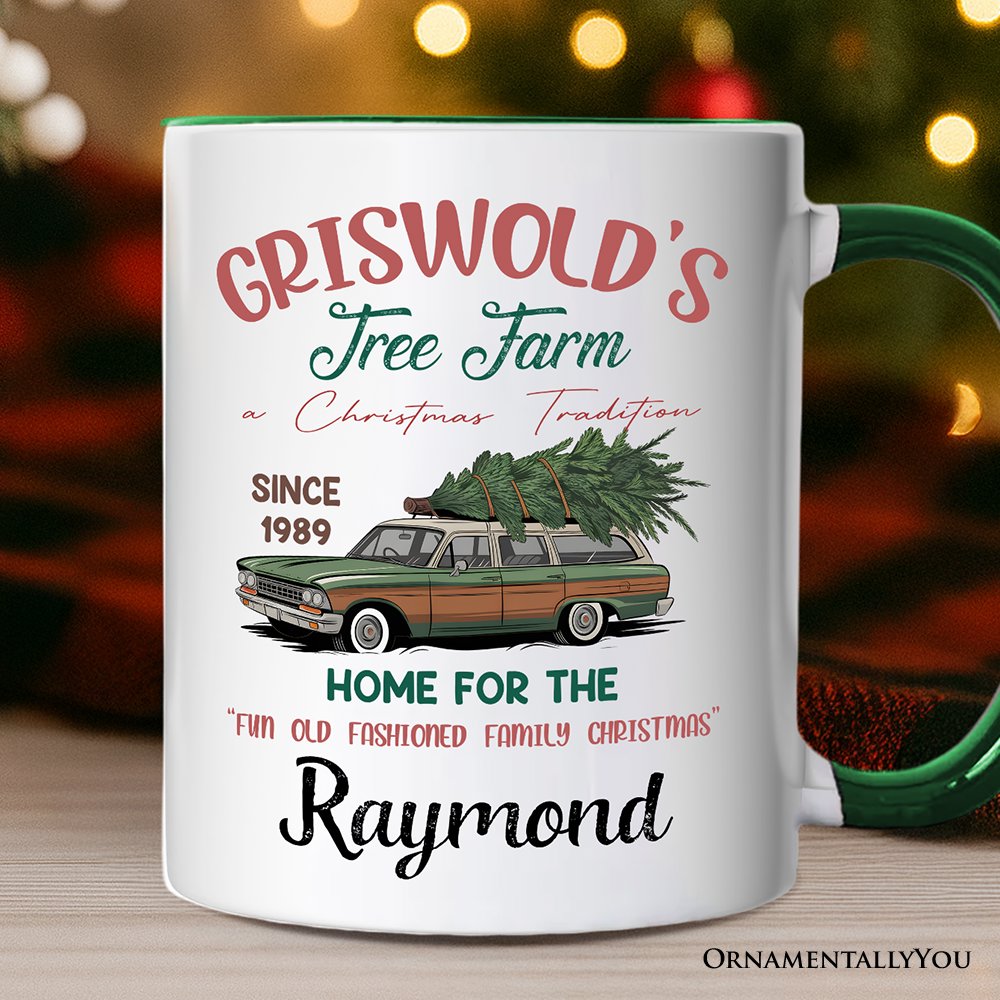 Griswoldโs Tree Farm Personalized Mug, Retro Family Christmas Vacation Gift with Custom Name