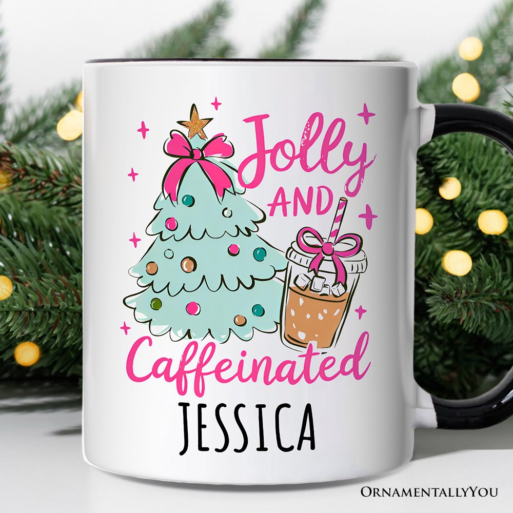 Jolly and Caffeinated Christmas Personalized Mug, Retro Coquette Coffee Holiday Gift with Custom Name Personalized Ceramic Mug OrnamentallyYou