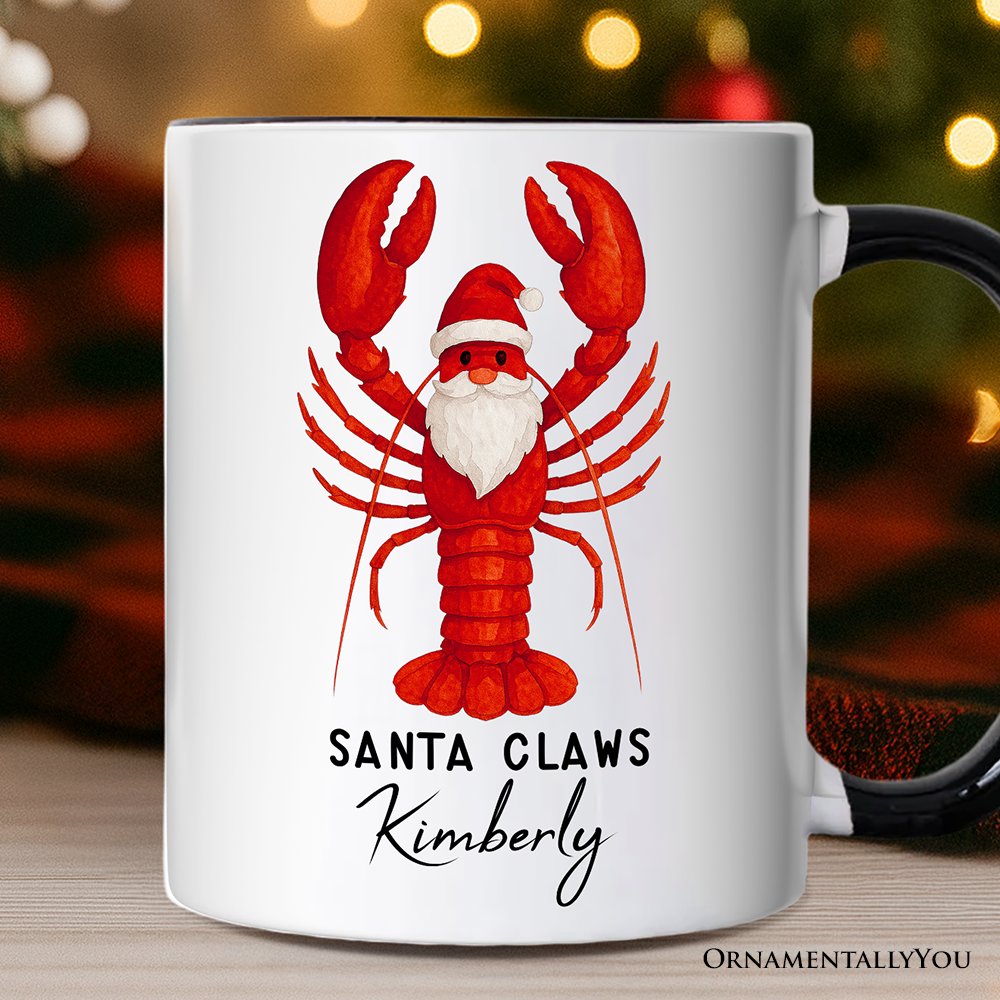 Santa Claws Lobster Personalized Mug, Funny Pun Coastal Christmas Holiday Gift with Custom Name