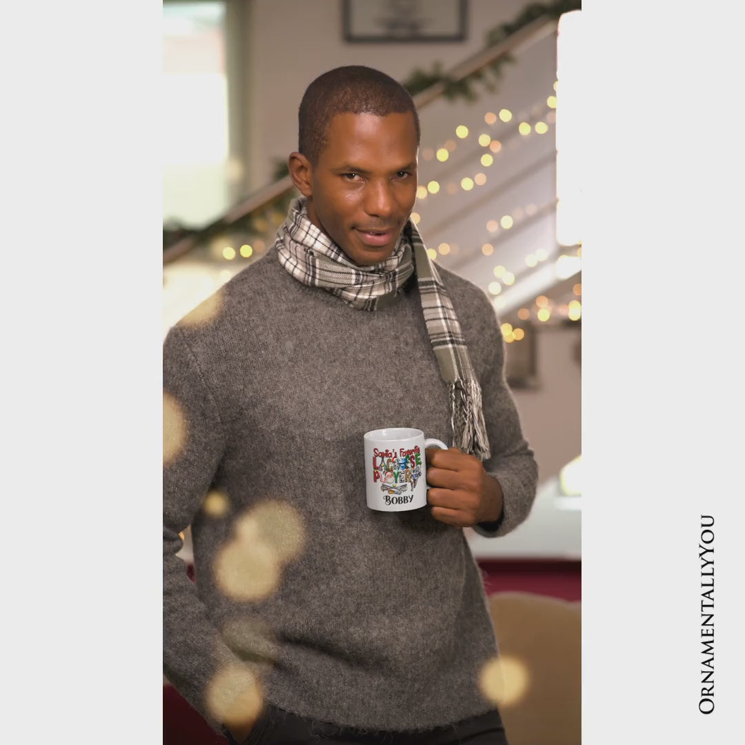 Santa’s Favorite Lacrosse Player Personalized Mug, Plaid Christmas Athlete Gift with Custom Name
