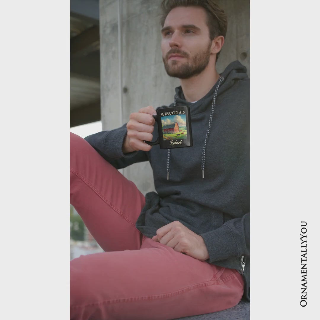 Vintage Wisconsin Farm Landscape Personalized Mug, Midwest Red Barn Gift and Countryside Souvenir with Custom Name