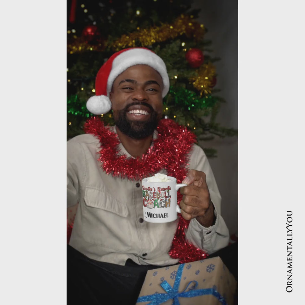 Santa’s Favorite Baseball Coach Personalized Mug, Plaid Christmas Athelete Gift with Custom Name