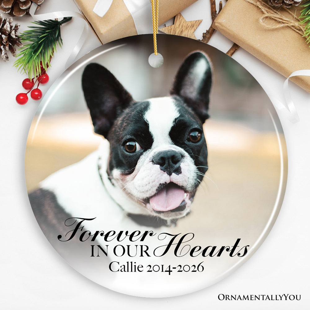 Honor the memory of your beloved furry companion with our Dog Memorial Personalized Picture Ornament. 🌈🐾❤️ This special ornament allows you to customize it with a cherished photo of your dog, creating a heartfelt tribute to the time you spent together. The ornament features a beautiful design with the words "Forever in our Hearts" and a paw print symbol, reminding you of the paw prints your dog left on your heart. Hang it on your Christmas tree or display it year-round as a way to remember and celebrate the love and joy your dog brought into your life. Our Dog Memorial Personalized Picture Ornament is a touching and meaningful way to keep the memory of your beloved dog alive in your heart. 🌈🐾❤️