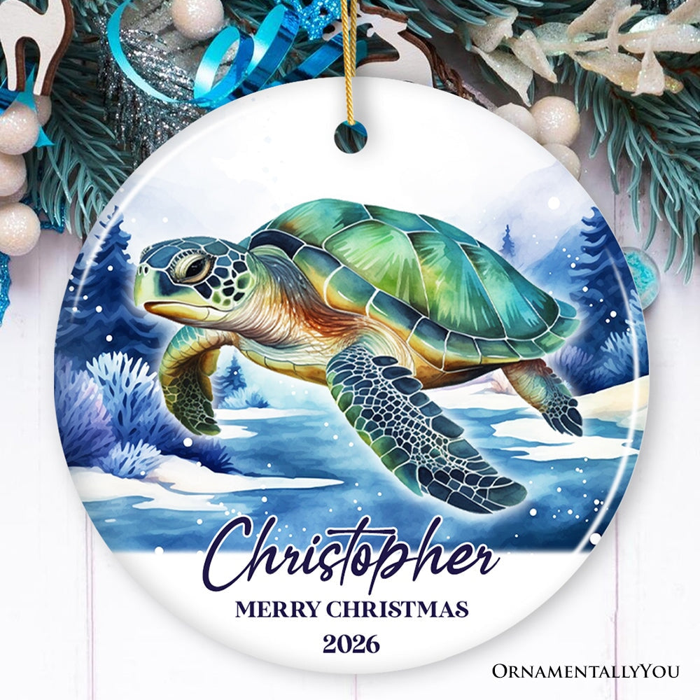 Green Turtle Personalized Ornament, Festive Christmas Gift With Custom Name and Date