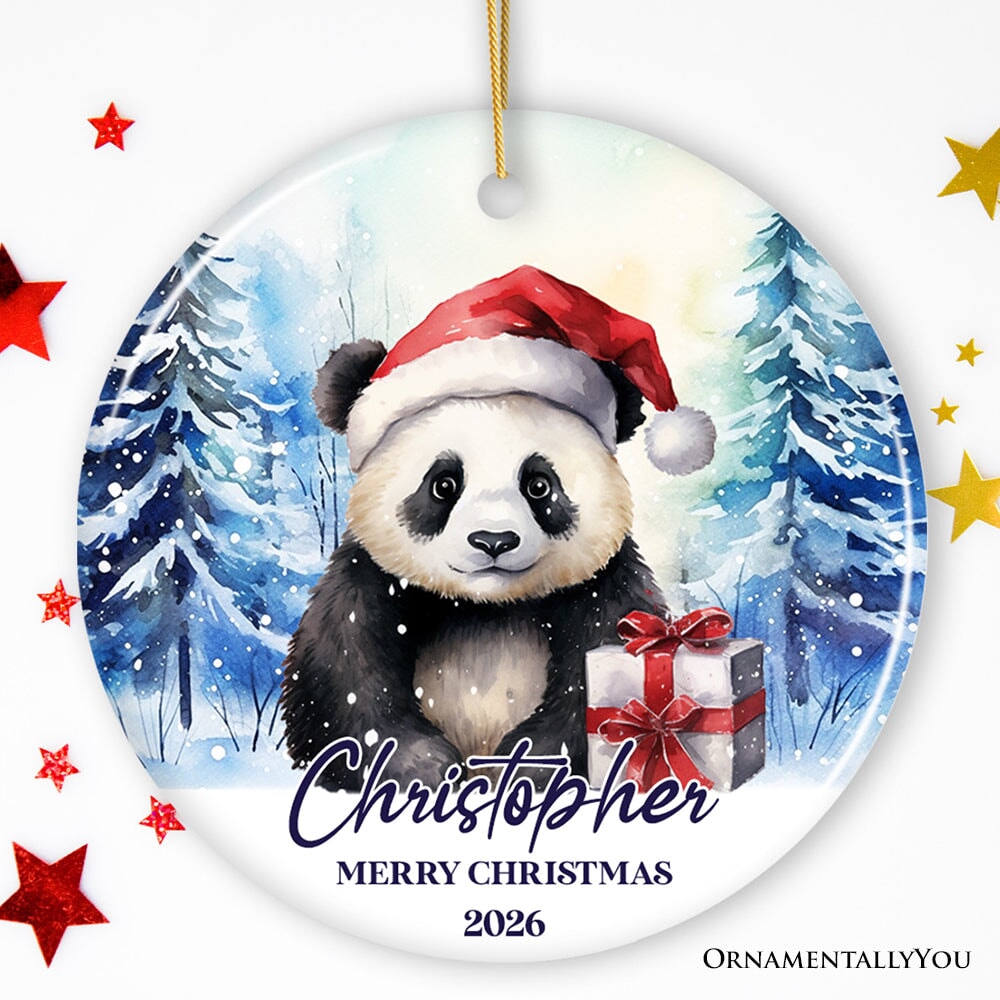 Panda with Santa Hat Personalized Ornament, Winter Forest Christmas Gift With Custom Name and Date