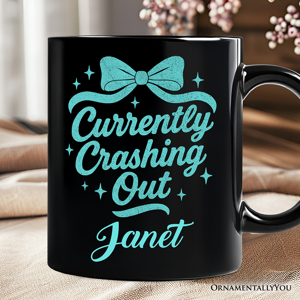 Girly Retro Bow Personalized Mug, Currently Crashing Out Sassy Quote Gift with Custom Name