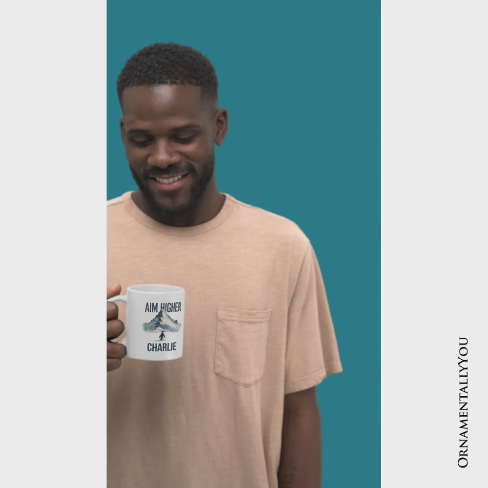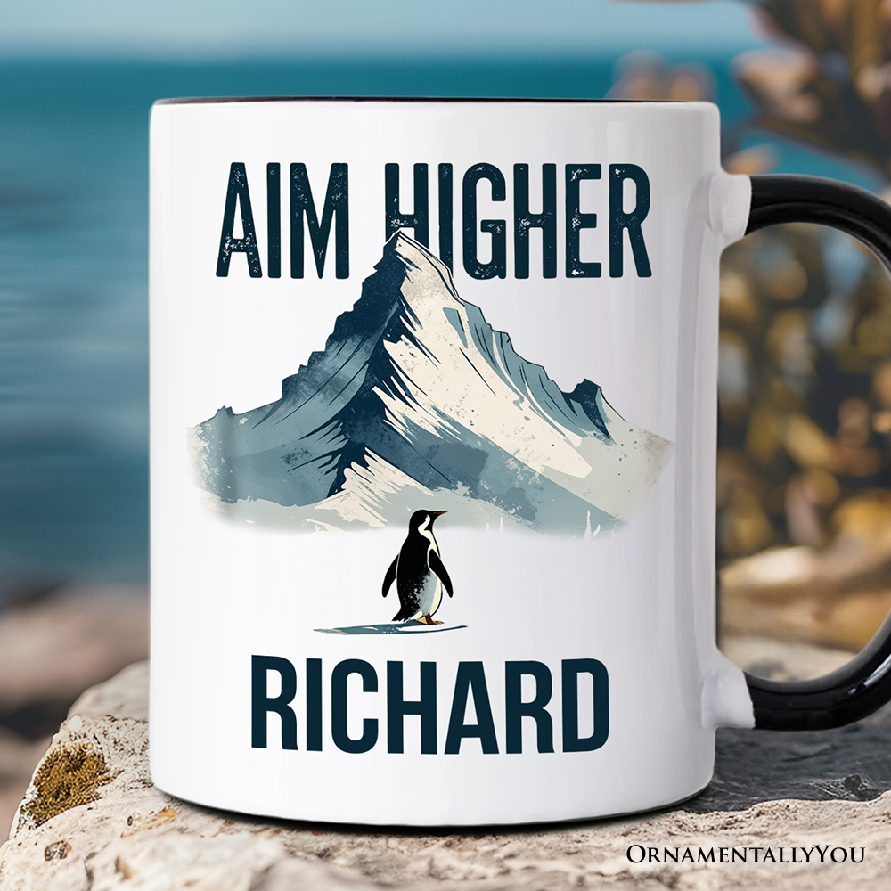 Aim Higher Penguin Personalized Mug, Vintage Mountain Motivational Quote Gift with Custom Name