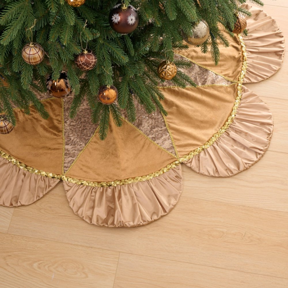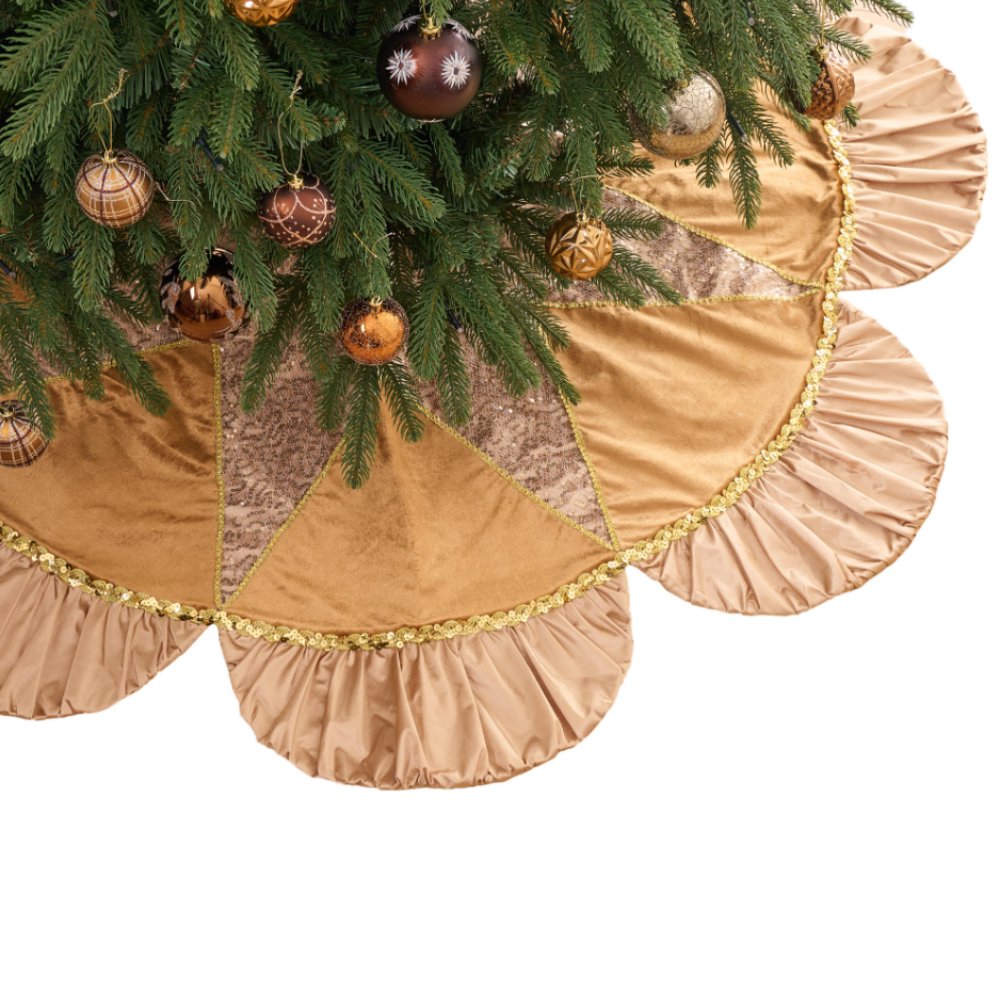 Dress your Christmas tree in elegance with this Luxury Gold Scalloped Tree Skirt, designed with a stunning patchwork of velvet and brocade panels, shimmering sequin accents, and a unique scalloped edge with pleated trim. Its rich golden tones create a warm and festive base, perfect for completing both traditional and glamorous holiday themes.
