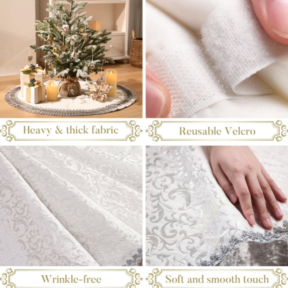 Measuring 120cm/48 inches in diameter, it’s designed to fit beautifully under medium to large Christmas trees, hiding unsightly stands and cords while creating a polished backdrop for gifts. Its neutral silver-and-white palette makes it versatile enough to complement classic, modern, and winter wonderland themes.