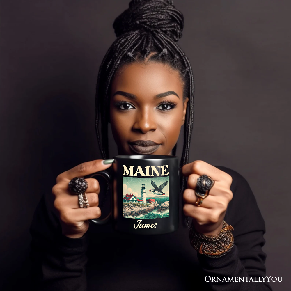 Vintage Maine State Lighthouse and Puffin Personalized Mug, New England Coastal Gift and Seaside Souvenir with Custom Name