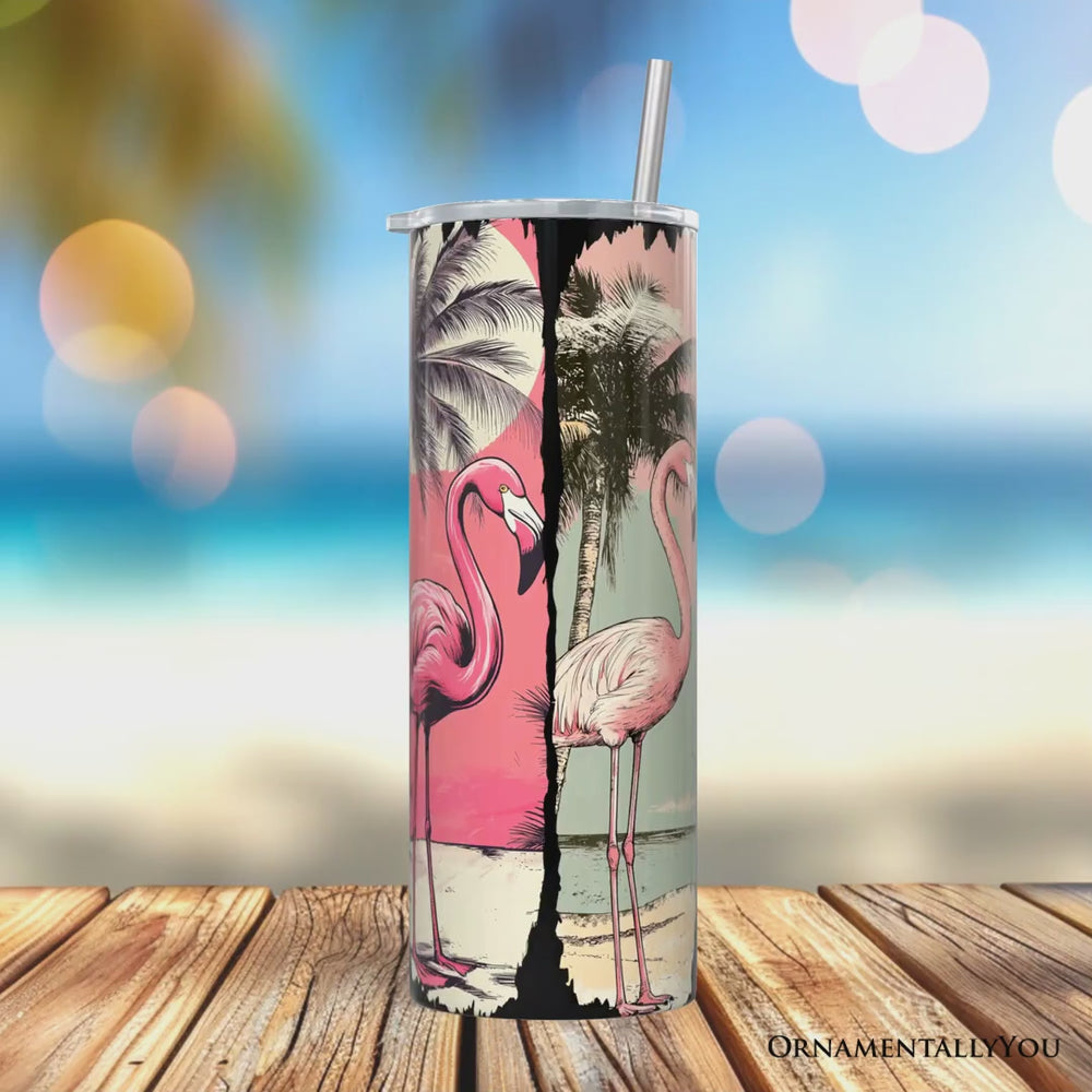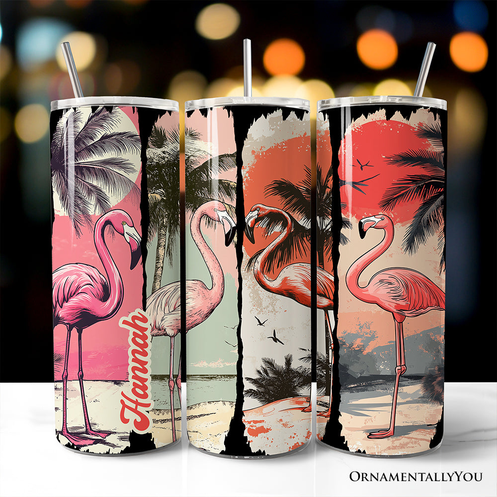 Retro Flamingo Beach 20oz Personalized Tumbler With Lid and Stainless Steel Straw, Summer Vacation Sunset Gift Cup