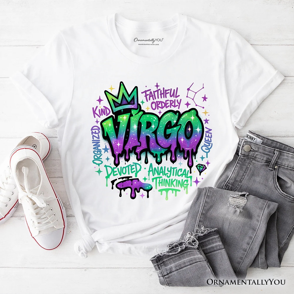 This edgy Virgo zodiac t-shirt blends bold graffiti art with modern streetwear style, making it a standout astrology shirt for everyday wear. Designed for horoscope lovers and fashion-forward souls, this graphic tee features eye-catching Virgo symbolism inspired by urban art and cosmic energy. Made for comfort and versatility, it pairs effortlessly with jeans, joggers, or layered looks, giving off confident, expressive vibes. Ideal for fans of zodiac fashion, astrology apparel, and street style graphic tees, this unisex t-shirt adds personality to any casual outfit ♍🖤✨