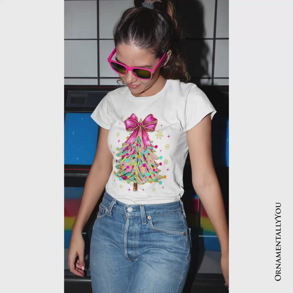 Colorful Glitter Christmas Tree Pink Bow T-Shirt, Pink Bow Coquette Holiday Tee