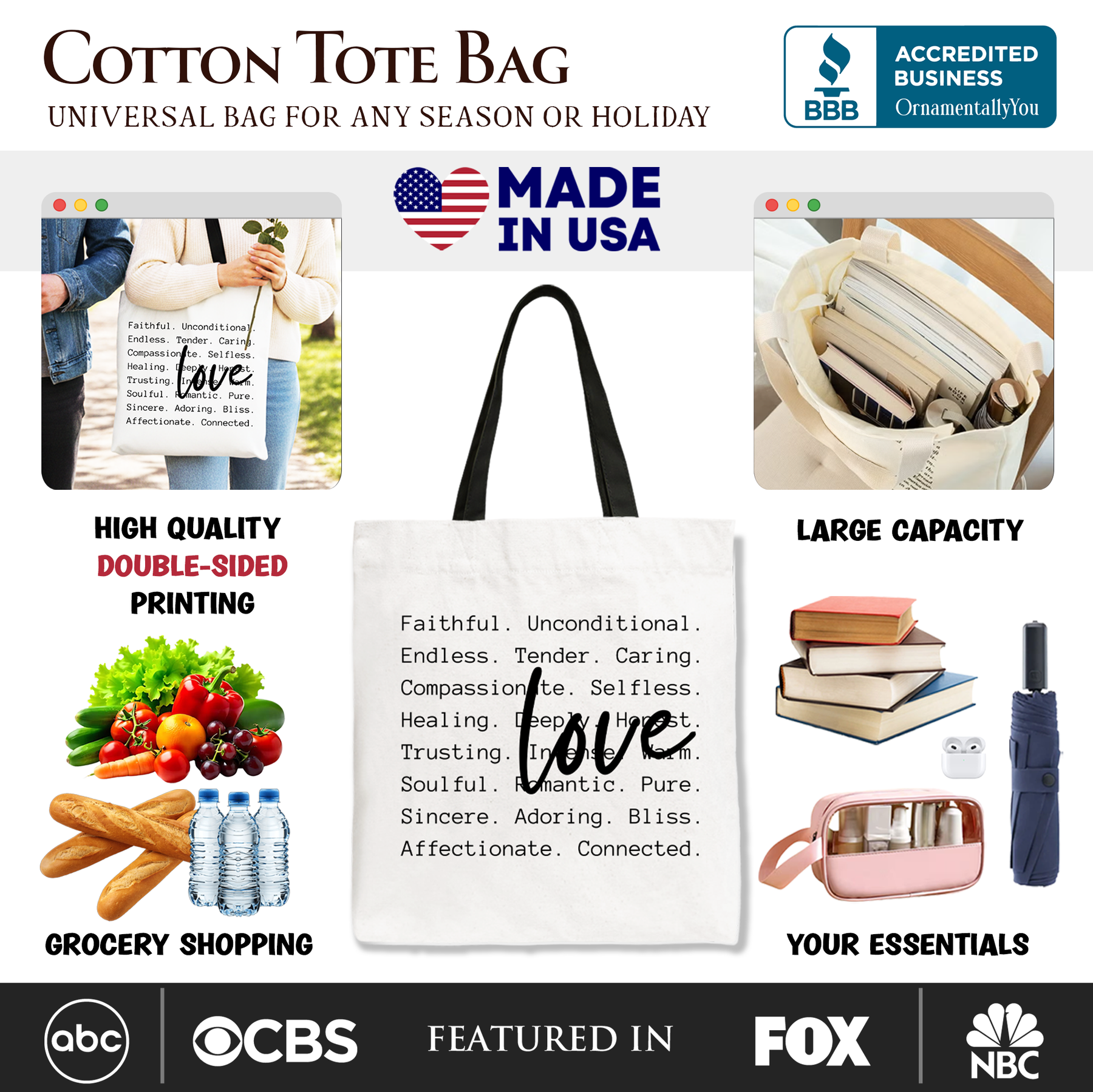 Carry your essentials in style with this minimalist canvas tote bag featuring a heartfelt love definition typography design that blends inspiration with everyday practicality ❤️ Crafted from durable, eco-friendly cotton canvas, this reusable shopping bag is perfect for grocery runs, bookstore visits, work, school, or casual daily use. The clean aesthetic and meaningful romantic quote make it a thoughtful Valentine’s Day gift, anniversary present, or sweet surprise for a partner, friend, or loved one 💕 Lightweight yet sturdy, this aesthetic shopper tote pairs effortlessly with modern wardrobes while supporting a sustainable, reusable lifestyle.