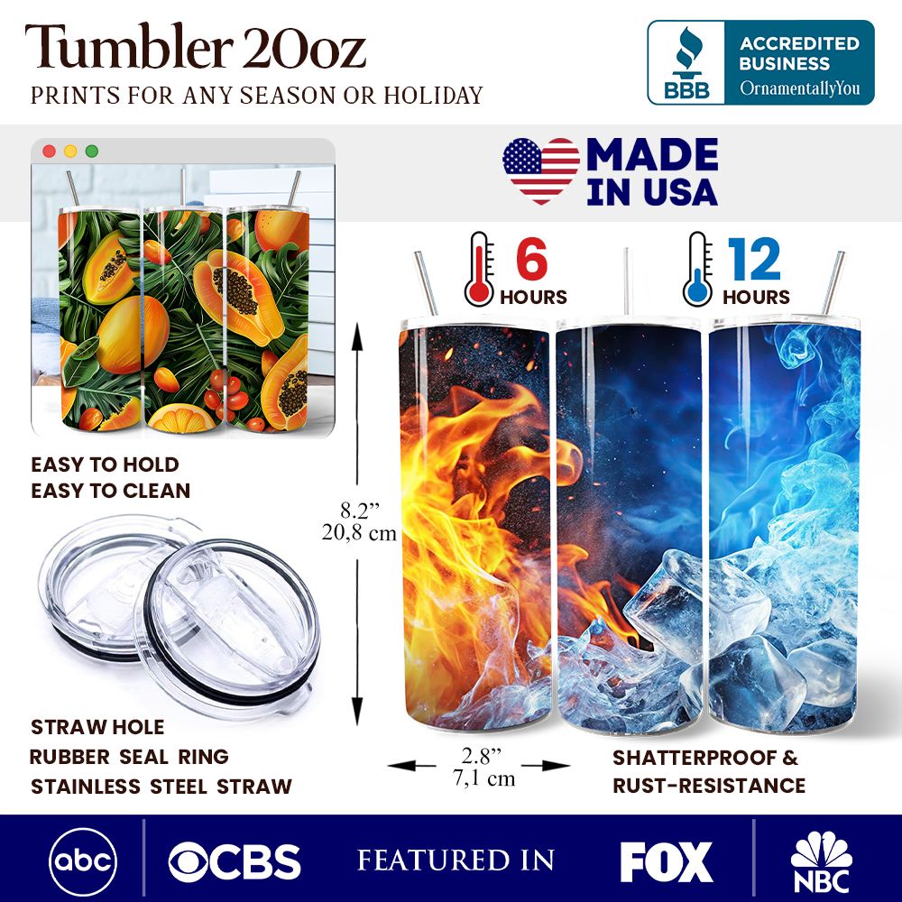 Bring the lush flavors of the tropics wherever you go with this Tropical Papaya, Mango and Citrus tumbler — a sun-drenched design bursting with exotic fruit energy. The vivid, juicy artwork captures the essence of a warm summer getaway, making every sip feel like a vacation. Whether you're chasing sunshine or just dreaming of it, this 20oz tumbler is the perfect way to carry a little tropical paradise with you all day long.