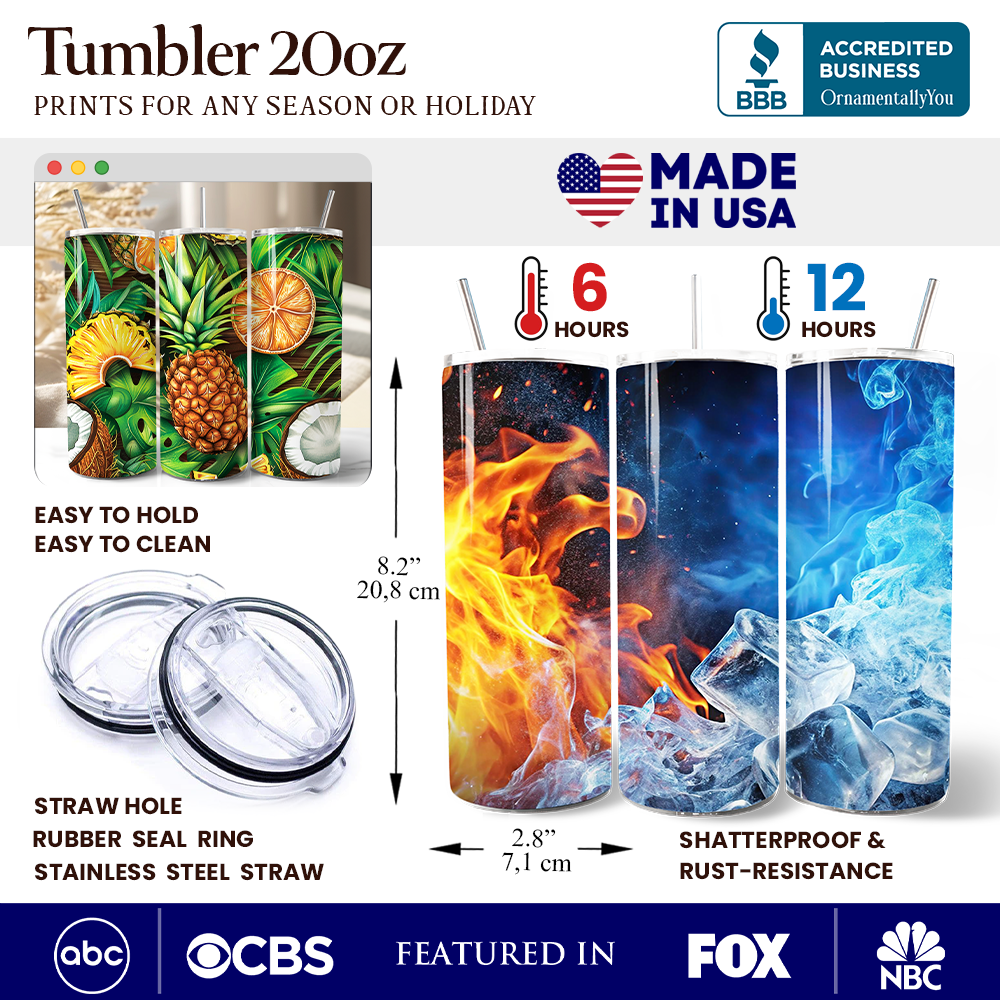 Escape to the tropics with every sip from this Tropical Pineapple, Citrus and Coconut tumbler — a cheerful, sun-kissed design that radiates island vibes all day long. The lush combination of golden pineapple, zesty citrus, and creamy coconut creates a refreshing visual that's as uplifting as your favorite summer drink. Perfect for beach days, backyard hangs, or brightening up your everyday routine, this 20oz tumbler brings a little slice of paradise wherever you take it.
